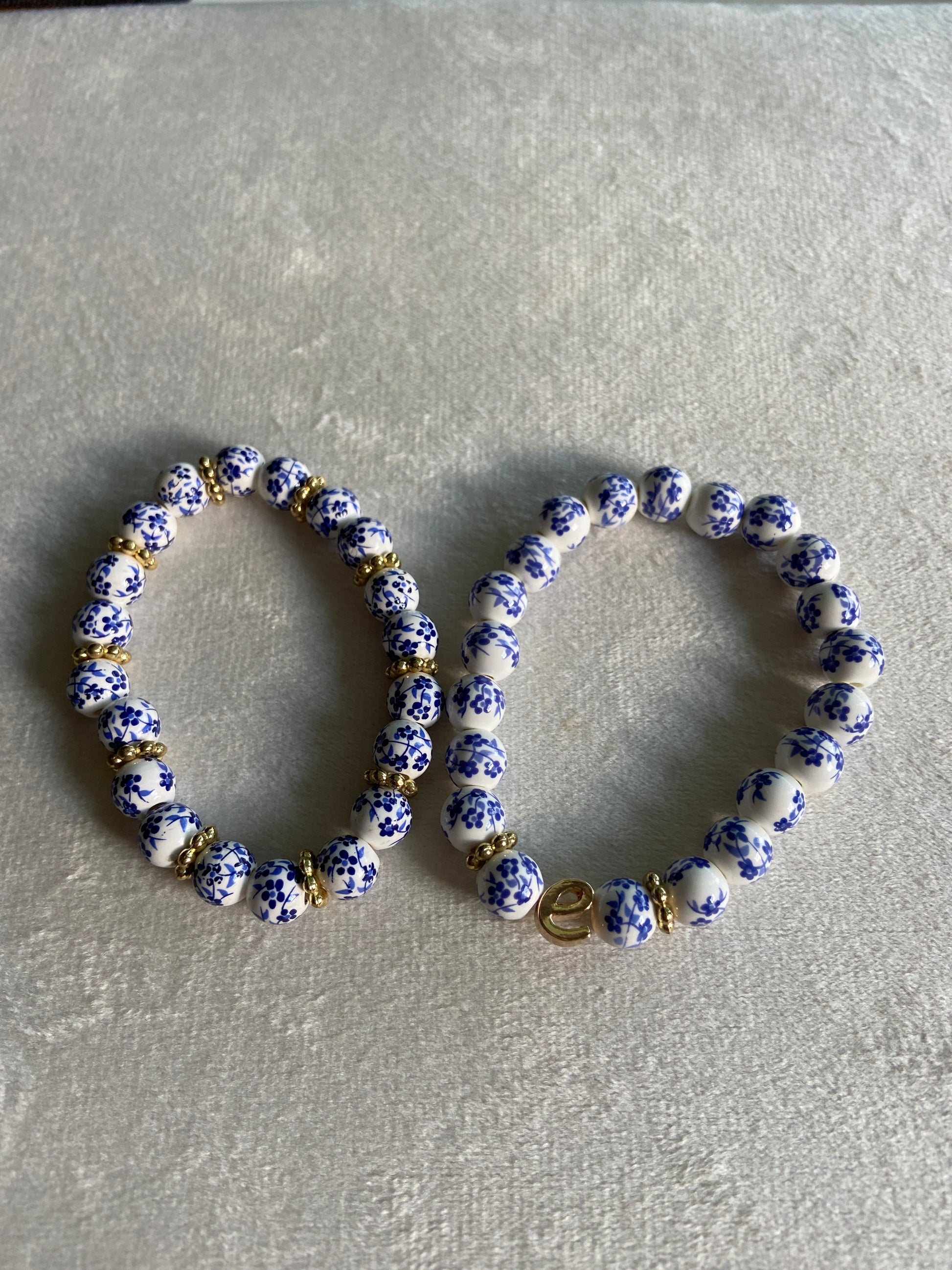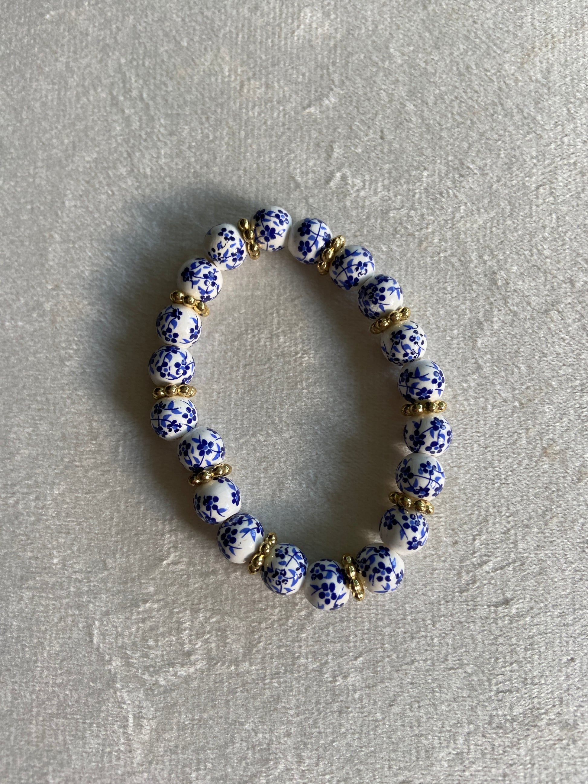 Blue and White ceramic beads with pops of gold on stretch cord.